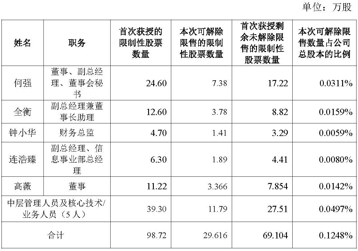 注:1.上述“首次获授的限制性股票数量”、“首次获授剩余未解除限售的限制性股票数量”仅包括本次可解除限售的10名激励对象获授限制性股票数量,不包含3名离职的激励对象获授限制性股票数量。