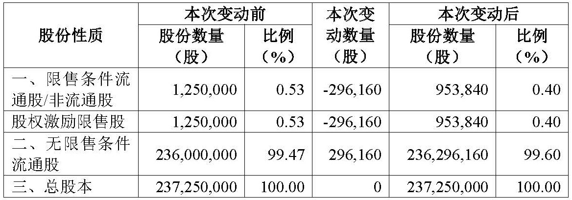 五、本次解除限售后公司股本结构变动表